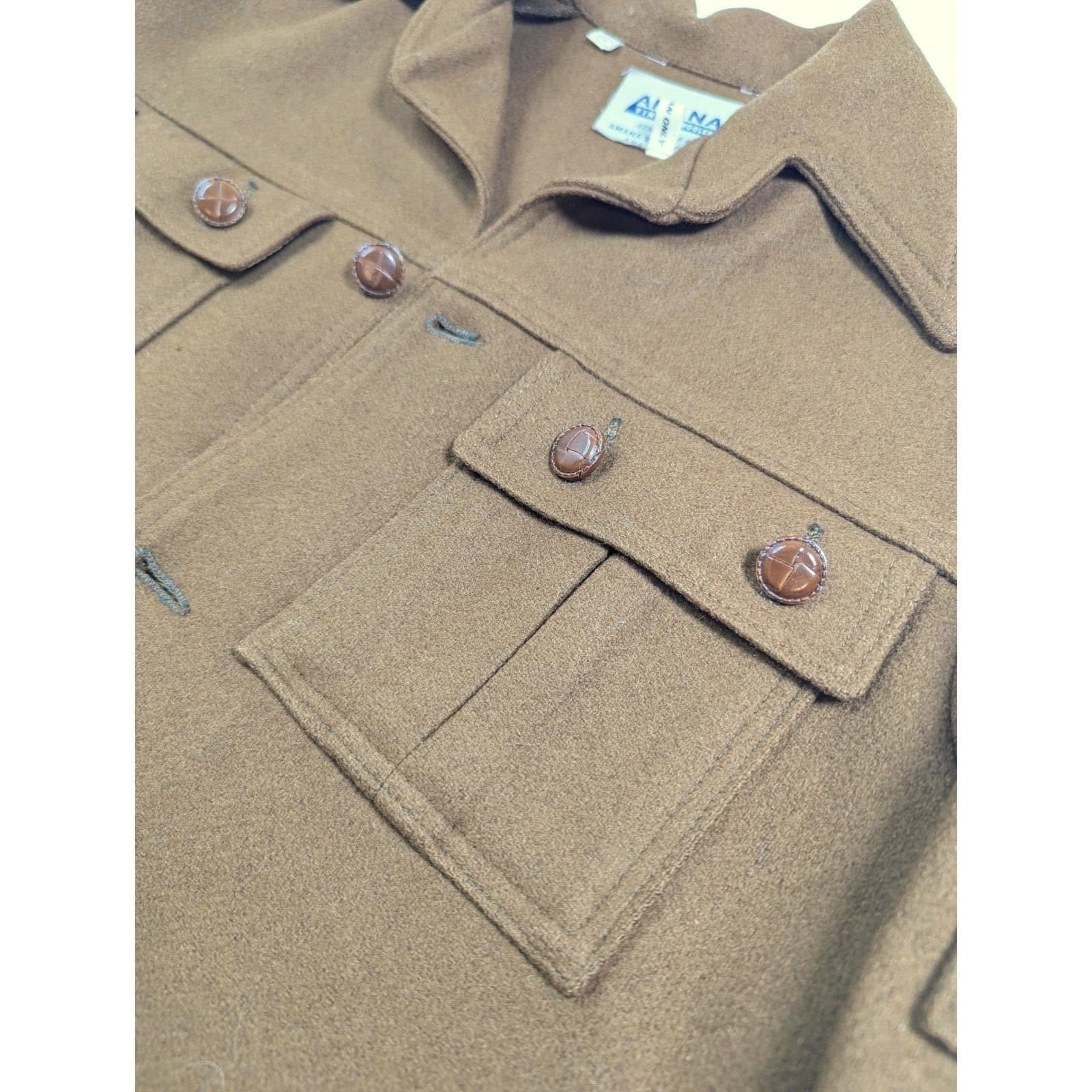 AMANA Fine Woolens vintage wool shirt jacket in a caramel brown tone, marked Size 5 (fits like Men's Small / Unisex Small-Medium). Button-up styling with classic heritage workwear construction and warm, structured wool.