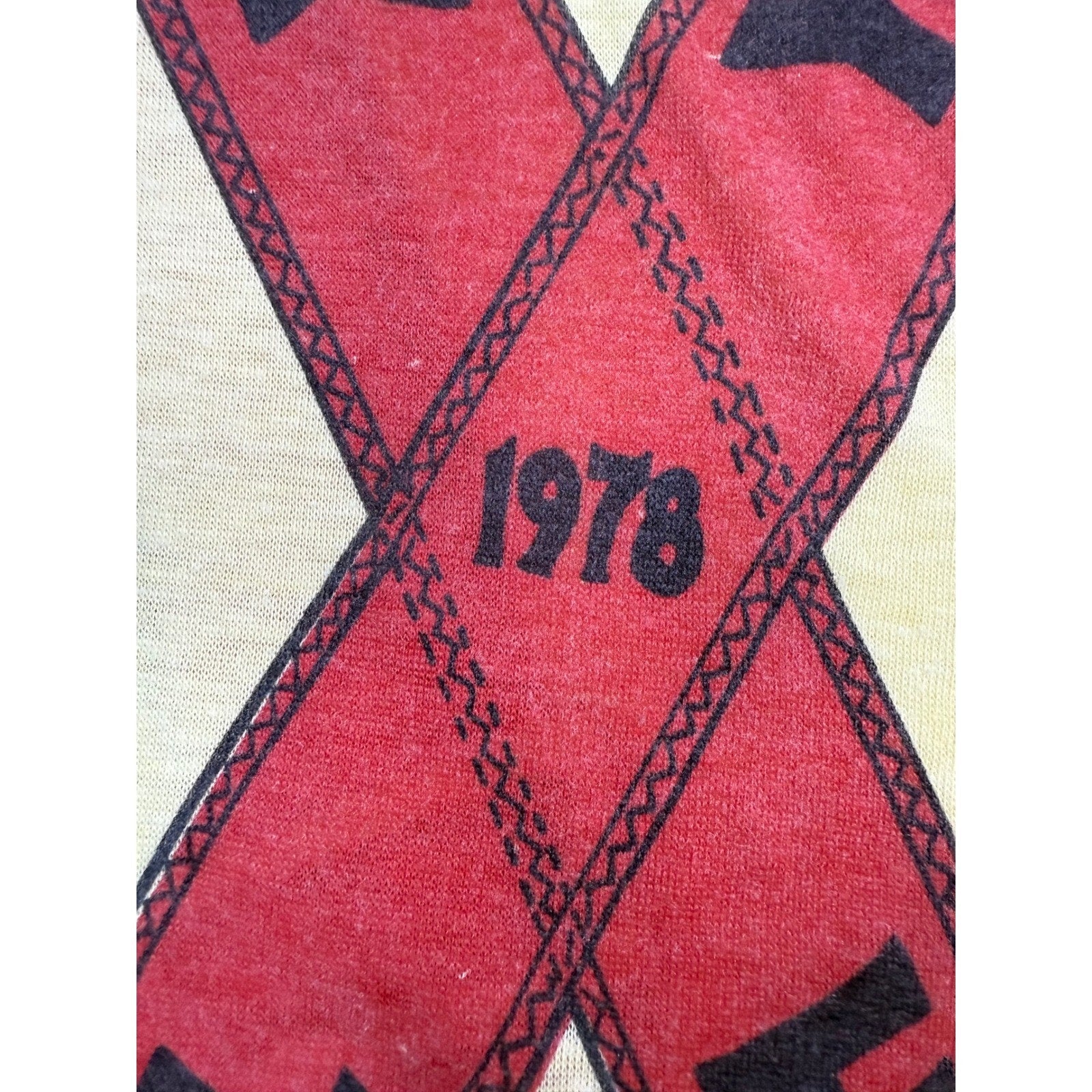 No holes that compromise wear. Light age spotting consistent with late-70s tees. Colors still strong.