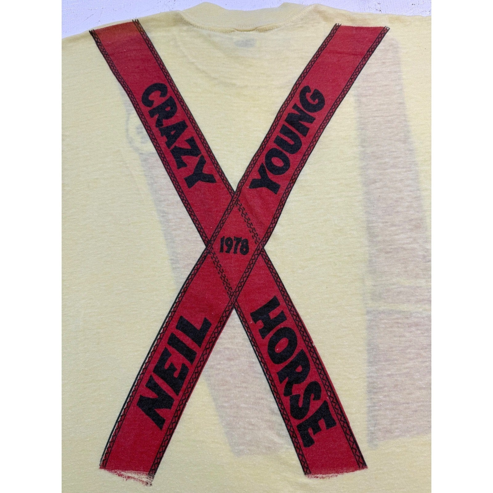 Vintage Neil Young & Crazy Horse T-shirt from the 1978 Rust Never Sleeps era featuring the iconic red suspender front print and matching "Crazy Horse / Neil Young / 1978" cross-back graphic.